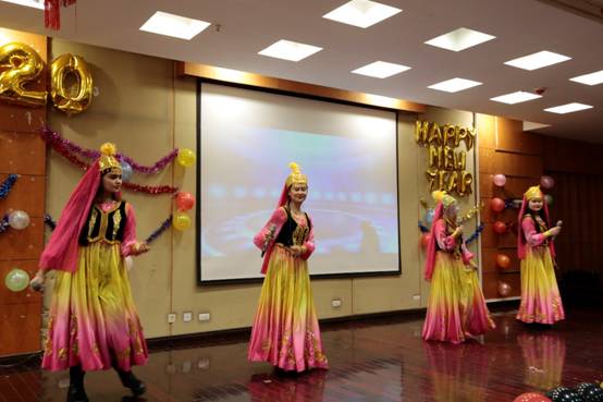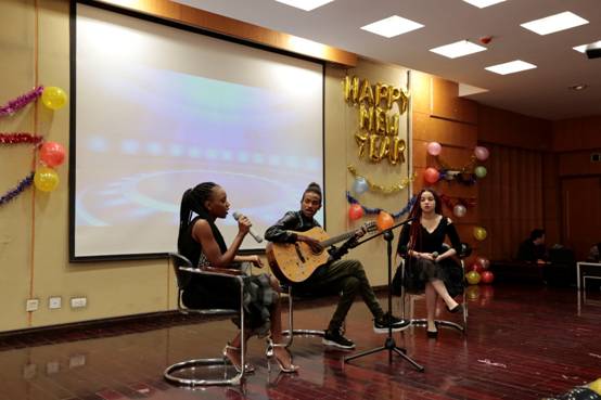 文艺表演环节异彩纷呈、形式多样。首先,四位能歌善舞的乌兹别克斯坦姑娘身着民族服装闪亮登场,她们随着音乐的律动载歌载舞,尽显异域风情;“对不起,我的中文不好……”来自吉布提的子吉和巴基斯坦的Danish为我们带来了这首中文歌曲,搞笑的歌词和贴近留学生生活的内容获得了观众的阵阵掌声;五名非洲学生演唱的《Papa ou t’es》,他们热情洋溢,引得台下的留学生们也跟着一起舞动;来自加纳的留学生Maxwell的小号演奏,向大家展现了留学生的多才多艺;非洲的三名留学生在流光溢彩的灯光下为观众带来了吉他弹唱《All of me》,深情的演绎温暖了每位观众;一首非洲串烧舞蹈,动感十足的非洲舞引爆全场,向观众展现了非洲特有的热情奔放,把联欢会推向高潮,让在场观众及嘉宾感受到了喜庆的迎新氛围。哈萨克斯坦、吉尔吉斯斯坦等国家留学生也参与了演出。