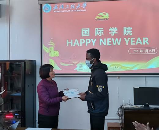 首先由书记、院长李琼代表学院向留学生提前致以新年的祝福,鼓励留学生在假期努力学习汉语,通过语言进一步了解中国的文化,同时也提醒留学生在假期要做好个人防护,时刻坚持疫情防控常态化。随后书记、院长李琼为2017级留学生Maxwell颁发毕业证与学位证。